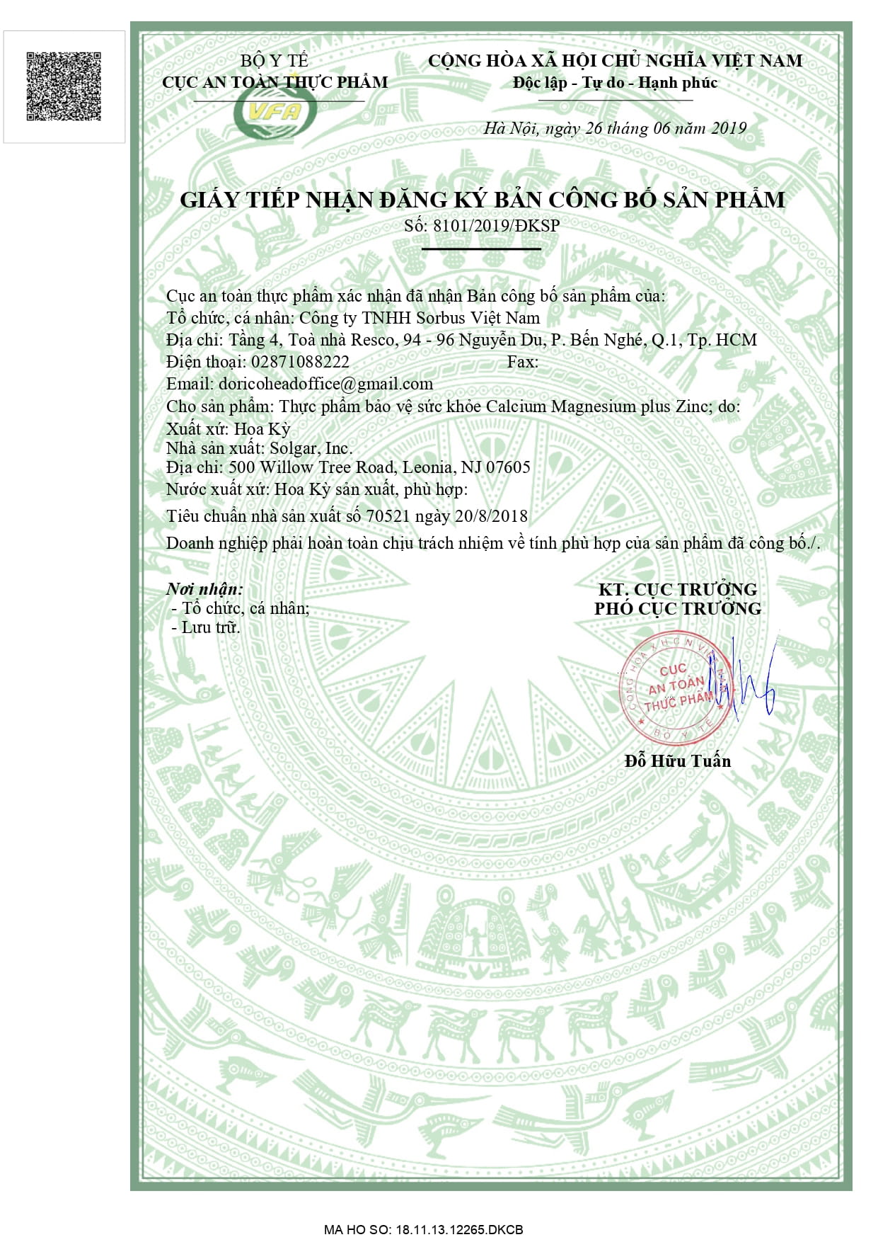 - Số ĐKCBSP: 8101/2019/ĐKSP.