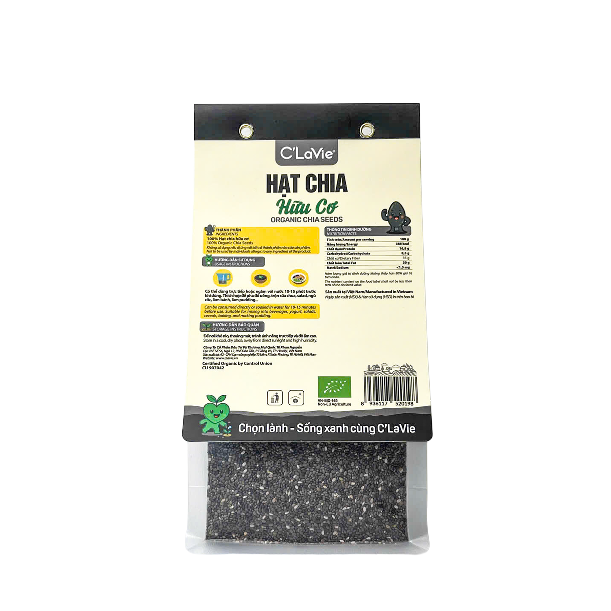 Hạt Chia Hữu Cơ C'LaVie được chọn lọc từ nguồn nguyên liệu đạt tiêu chuẩn hữu cơ Châu Âu (EU Organic) – không thuốc trừ sâu, không phân bón hóa học, không biến đổi gen. Đây là lựa chọn lý tưởng cho những ai muốn bổ sung dưỡng chất tự nhiên, lành mạnh vào chế độ ăn hàng ngày một cách đơn giản và hiệu quả.